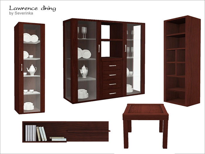 Набор мебели и декора "Лоренс" для столовой из 19 предметов: обои, полупрозрачные развевающиеся шторы (правые и левые), шкаф со слотами, сервант с посудой узкий, сервант с посудой широкий, комод, полка настенная с книгами, обеденный стол, обеденный мягкий стул, ковер, бокалы 2-х форм, тарелка на бамбуковой салфетке, 3 вида ваз, ваза с пальмовыми листьями, рамка для фото.